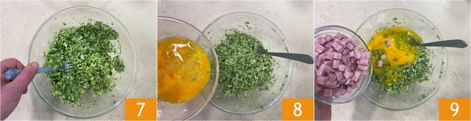 Machácalos con un tenedor 7, luego incorpora los huevos 8 y los cubitos de jamón 9.<\/p>