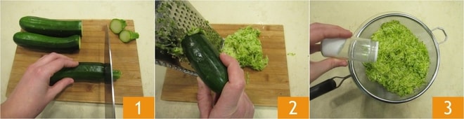 Para preparar las albóndigas de calabacín, empieza lavando bien los calabacines y quitándoles los extremos 1. Rállalos con un rallador de agujeros medianos 2, colócalos en un colador puesto encima de un bol y sala ligeramente 3.