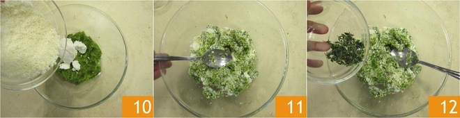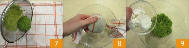 Luego vuelca los calabacines ya escurridos sobre un paño limpio 7; enróllalo como un caramelo alrededor de los calabacines y exprime bien 8. Así los calabacines perderán las últimas trazas de agua. Ponlos en un bol y añade la ricotta (que habrás escurrido y tamizado) 9.