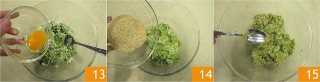 Finalmente añade el huevo 13 y el pan rallado 14. Mezcla bien para amalgamar todos los ingredientes entre sí 15.