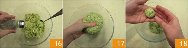 Ajusta de sal y pimienta 16. Trabaja la masa con las manos hasta que quede homogénea y lo suficientemente consistente como para formar una bola 17. Procede ahora a formar tus albóndigas tomando 20 g de masa para cada una y dándoles la clásica forma redonda y ligeramente aplastada 18.