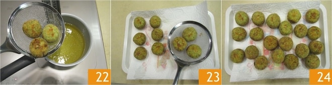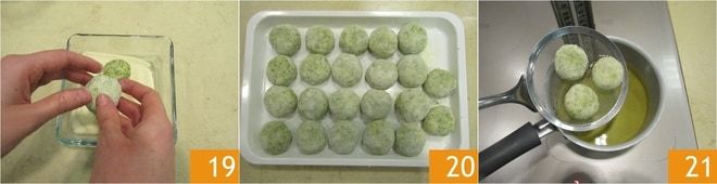 Pasa las albóndigas por la sémola 19 y colócalas en una bandeja: deberías obtener unas 22 albóndigas 20. Vierte el aceite de semillas en un cazo y llévalo a 180°, luego sumerge pocas albóndigas a la vez 21.