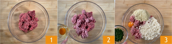 Para preparar las albóndigas de carne, en un bol unid la carne picada de ternera y la de cerdo 1, el huevo 2, la miga de pan fresco triturada, el Parmigiano Reggiano DOP rallado y el perejil picado 3.