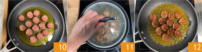 Dorad bien las albóndigas por todos lados, llevará unos 6-7 minutos 10. En este punto, cubrid con una tapa 11 y cocinad por otros 3 minutos, así se cocinarán también por dentro. Las albóndigas de carne están listas 12.