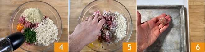 Sazonad con sal y pimienta 4 y mezclad bien todos los ingredientes, amasad enérgicamente 5 para obtener una mezcla homogénea. Dejad reposar la masa 30 minutos cubierta en la nevera. Después del reposo, sacad la masa de la nevera y con las manos húmedas tomad 25 g de la mezcla y dándole vueltas entre las manos formad una bola. La primera albóndiga está lista 6.