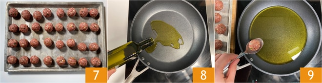 Conforme las vayáis formando, colócalas en una bandeja 7. Calentad un dedo de aceite en una sartén antiadherente 8. La cantidad de aceite debe llegar hasta la mitad de la albóndiga. Cuando el aceite esté caliente, sumergid las albóndigas con cuidado 9.