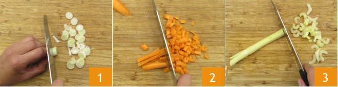 Para realizar las albóndigas de cerdo en caldo, primero prepara el caldo: limpia las verduras, luego corta los cebolletas en rodajas finas 1 y reduce tanto las zanahorias como el apio en trozos de medio centímetro 2 3.