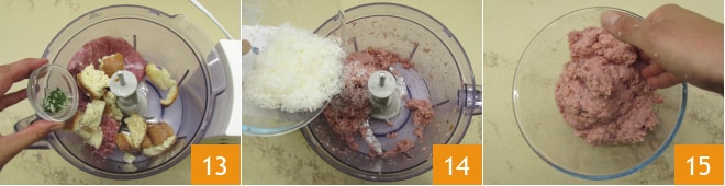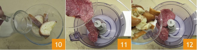 Mientras tanto, remoja el pan en la leche a temperatura ambiente 10 y dedícate a las albóndigas: vierte en un procesador la carne picada de cerdo 11, luego añade el pan remojado 12.