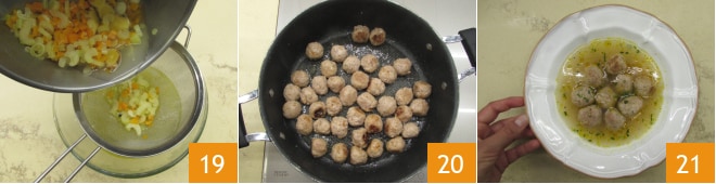 En este punto, el caldo estará listo, así que cuélalo en un bol 19. Cuando las albóndigas también estén cocidas 20, monta los platos con el caldo caliente y las albóndigas y adorna con perejil picado 21!