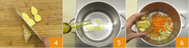 Pela y corta el jengibre en rodajas 4. Calienta un chorrito de aceite en una olla 5, luego añade las verduras junto con el jengibre 6 y deja dorar por un par de minutos.