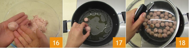 Con las manos forma bolitas de unos 3 cm de diámetro 16: con estas cantidades obtendrás unas 30. Calienta un chorrito de aceite en una sartén y coloca las albóndigas dentro 17. Cocina con la tapa a fuego medio-bajo durante 10 minutos, luego retira la tapa 18 y continúa la cocción por otros 5 minutos como máximo, moviendo la sartén hasta que estén doradas. Sala y pimienta al gusto.