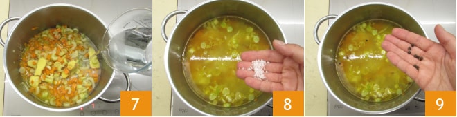 Vierte el agua 7, sala 8 y añade los granos de pimienta negra 9, luego cocina a fuego lento durante unos 30 minutos.