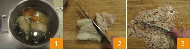 Con el cocido de costillar sobrante de tus cenas 1, comienza a preparar la masa para las albóndigas de cocido y ricotta. Elimina el hueso de la carne, así obtendrás unos 400 g. Corta los trozos de cocido, picándolos cuidadosamente con un cuchillo (2-3).