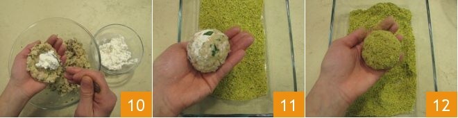 y coloca en el centro unos 10 g de ricotta de oveja 10. Cierra la albóndiga dándole una forma redonda y asegurándote de que el relleno esté bien sellado por dentro 11: con estas cantidades obtendrás unas 15 albóndigas. Ahora vierte en un bol la harina de pistacho y en otro bate los huevos; pasa cada albóndiga primero por la harina de pistacho 12,