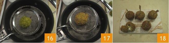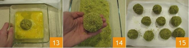 luego por los huevos 13 y finalmente de nuevo por la harina de pistacho 14. Ahora tus albóndigas están listas para ser fritas 15.