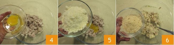 Transfiere el picadillo a un bol y añade el huevo 4, el parmesano 5, el pan rallado 6 y mezcla todo bien.