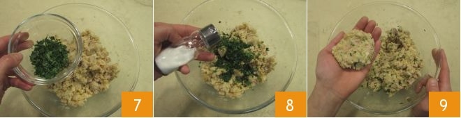 Pica finamente el perejil y añádelo a la masa 7. Sala la masa obtenida 8 y trabájala con las manos. Toma unos 30 g de masa, extiéndela delicadamente en la palma de la mano 9