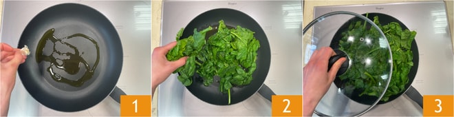 Para preparar las albóndigas de espinacas calienta una sartén, añade un chorrito de aceite y un diente de ajo entero 1. Déjalo calentar ligeramente, luego añade las espinacas limpias, cubre con la tapa 3 y cocina durante unos 3 minutos, o hasta que estén tiernas.