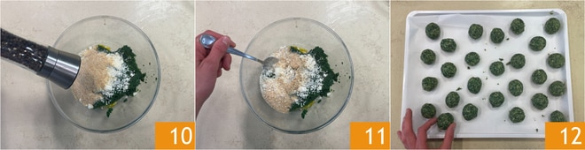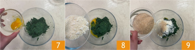 Una vez escurridas, pon las espinacas en un bol, añade el huevo 7, el Grana Padano DOP rallado 8 y el pan rallado 9.