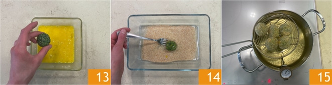 Ahora empana las albóndigas pasándolas primero en el huevo batido 13 y luego en el pan rallado 14. Fríe pocas albóndigas a la vez en aceite de semillas calentado a 170° (medido con termómetro de cocina) durante unos 3 minutos 15.