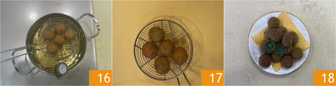 Escurre las albóndigas cuando estén bien doradas 16 y colócalas sobre papel absorbente 17. Sirve las albóndigas de espinacas calientes o tibias 18.
