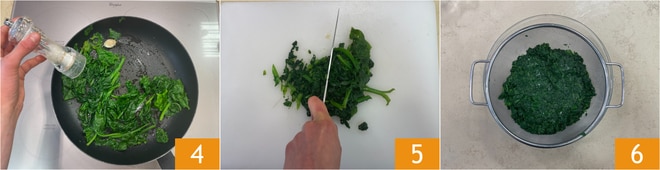 Quita la tapa, deja que las espinacas se sequen del líquido de cocción durante aproximadamente 1 minuto y sazona con sal. Deja que las espinacas se templen y pícalas con un cuchillo 5, colócalas a escurrir en un colador, presionando con una cuchara.