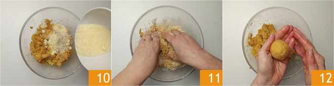 Luego añadid el queso rallado 10 y el pan rallado. Amasad 11 hasta obtener una mezcla homogénea. Con las manos humedecidas formad albóndigas de unos 50 g de peso 12. Se obtendrán 13.