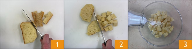 Para preparar las albóndigas de pan en sartén, corta el pan en rebanadas y quita la corteza 1, luego redúcelo a pequeños trozos 2. Traslada el pan a un bol, vierte la leche y déjalo ablandar por unos minutos 3.