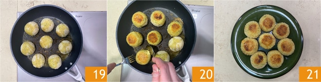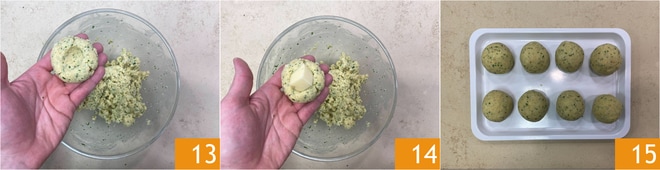 Aplástalas en el centro 13 e introduce un cubito de fontina 14. Continúa hasta terminar la mezcla 15.