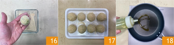 Pasa cada albóndiga por el pan rallado 16 17. En una sartén, calienta un poco de aceite 18.