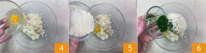 Agrega el huevo 4, el queso rallado 5 y el perejil 6.