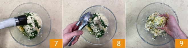 Sala 7, añade pimienta y condimenta con un diente de ajo machacado 8. Amasa la mezcla con las manos 9.