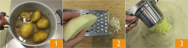 Para preparar las albóndigas de patata, primero hervir las patatas comenzando con agua fría durante unos 30-40 minutos desde el hervor hasta que estén blandas, verificando con los dientes de un tenedor 1. Mientras tanto, rallar el caciocavallo con un rallador de agujeros grandes 2. Cuando las patatas estén cocidas, pelarlas y triturarlas aún calientes dentro de un bol 3.