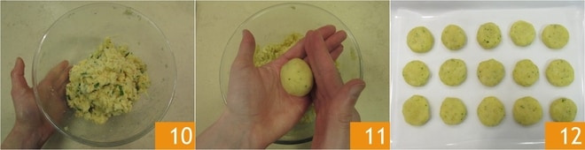 Mezclar con un tenedor hasta obtener una mezcla homogénea 10. Ahora tomar pequeñas porciones de masa de unos 25 g cada una y formar bolas, luego aplastarlas ligeramente entre las palmas de las manos 11. A medida que estén listas, colocar las albóndigas en una bandeja 12.