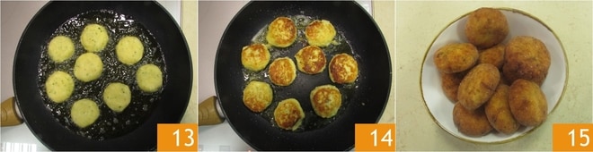 Verter un dedo de aceite en una sartén antiadherente y ponerla al fuego. Cuando el aceite esté bien caliente, añadir las albóndigas y dorarlas por ambos lados 13, tomará pocos minutos 14. Escurrir las albóndigas de patata sobre papel absorbente y servirlas aún calientes 15!