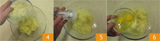 Añadir el caciocavallo 4, la sal 5, la pimienta y los huevos 6.