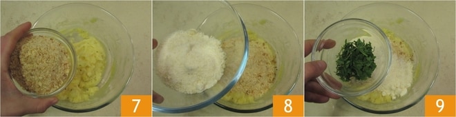 También añadir el pan rallado 7, el Grana rallado 8 y el perejil picado 9.