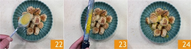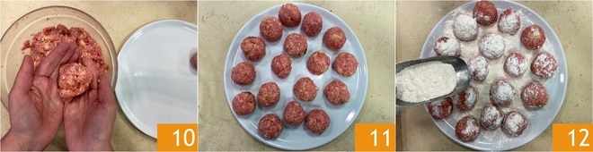 Toma una porción de la mezcla y forma albóndigas del tamaño de una nuez, rodándolas entre las palmas de las manos 10, luego colócalas todas en un plato 11. Enharínalas bien por todos los lados 12.