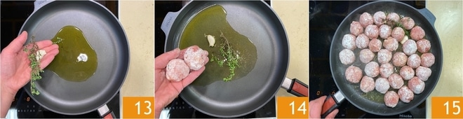 En una sartén amplia, calienta un poco de aceite de oliva virgen extra con un diente de ajo aplastado y unas ramitas de tomillo 13. Una vez bien caliente, coloca las albóndigas en la sartén 14 y déjalas dorar a fuego medio-alto, girándolas de vez en cuando hasta que estén doradas por toda la superficie 15.