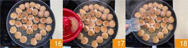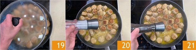 Cubre la sartén con una tapa 19 y cocina las albóndigas a fuego lento durante unos 15-20 minutos, hasta que estén tiernas y bien cocidas por dentro. Ajusta de sal 20 y pimienta negra recién molida 21 al final de la cocción.