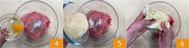 Incorpora un huevo entero 4. Añade también el queso parmesano rallado 5, luego incorpora el pan ya remojado y bien escurrido con las manos 6.