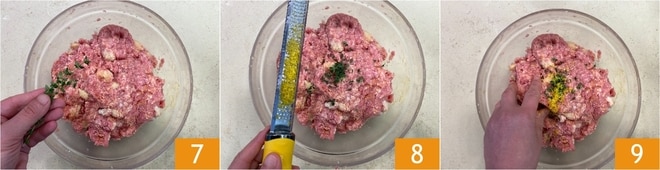 Sazona con unas hojas de tomillo fresco 7 y ralla la cáscara de un limón directamente dentro del bol 8. En este punto, amasa todos los ingredientes con las manos hasta obtener una mezcla homogénea, suave pero compacta 9.