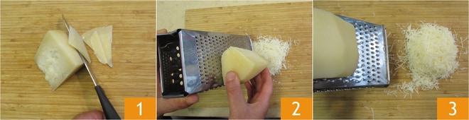 Para preparar las albóndigas de queso, elimina la corteza de los quesos 1 y rállalos con un rallador de rejilla fina 2 3. Reserva los quesos y ocúpate del pan.