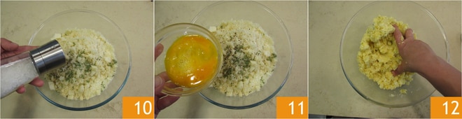 Sala 10, añade pimienta y finalmente vierte los huevos 11. Amasa con las manos hasta obtener una mezcla bastante compacta 12.