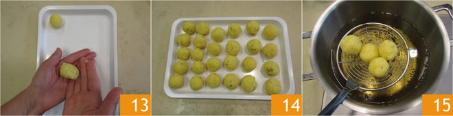 Forma bolas de unos 20 g cada una 13. Con estas cantidades obtendrás 36 albóndigas 14. Ahora fríe en aceite ya caliente a 170° 15. Fríe pocas albóndigas a la vez porque tienden a pegarse durante la cocción y además bajaría la temperatura.