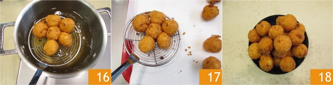 Una vez doradas, en pocos minutos, escúrrelas 16 y transfiérelas a papel absorbente 17. Sirve las albóndigas de queso bien calientes 18.