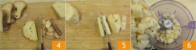 Saca la corteza del pan 4 y corta la miga en cubos 5, luego tritúralos con una batidora 6.