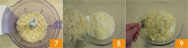 Una vez obtenidas las migas 7, mézclalas con los quesos 8 y aromatiza con el tomillo 9.