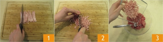 Para preparar tus albóndigas, pica el perejil. Luego corta y pica también la mortadela finamente 1 2. Viértela en un bol junto con la carne picada 3.
