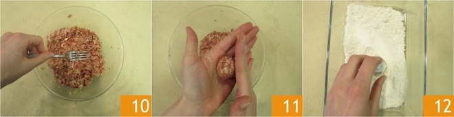 Mezcla de nuevo hasta obtener una masa uniforme 10. Forma las albóndigas: toma aproximadamente 20 g de masa con las manos húmedas y dales forma redonda 11. Pasa las albóndigas por harina 12.